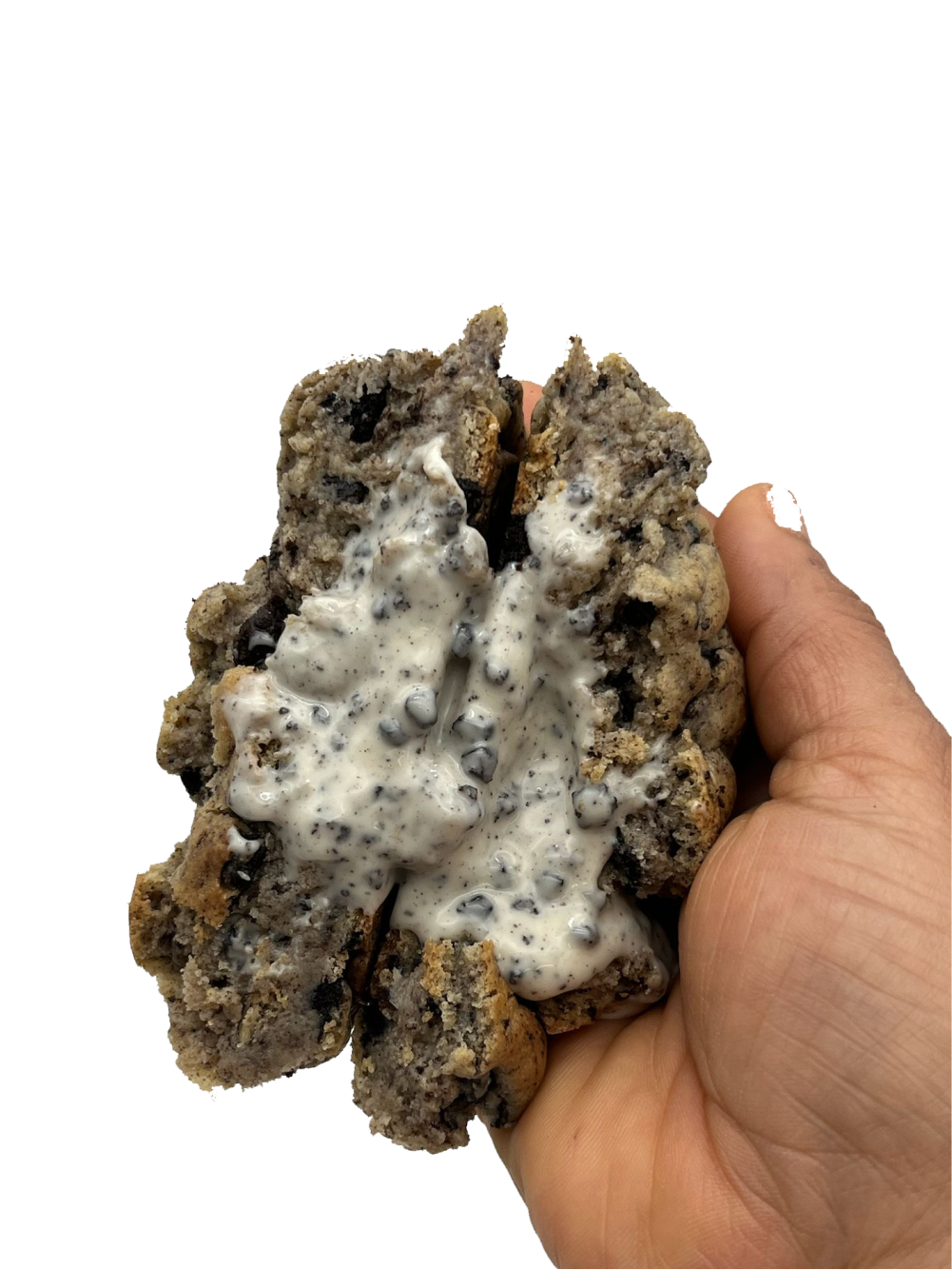 Cookies & cream cookie with Oreo pieces, creamy filling, and silky glaze, topped with a mini Oreo for a smooth and seductive treat.
